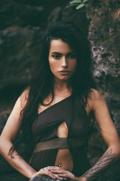 The shorter version of the Asymmetric Dress cut thigh level in the front, dropping to knee level in the back. One shoulder dress, adjustable at the back with 4 stretch ties. Cotton suede empire belt detail under bust line creates extra support. Dress has frontal cut-out that cheekily focuses on a different kind of décolletage.